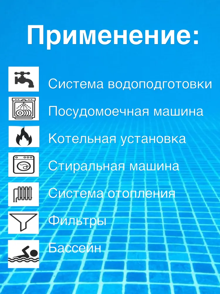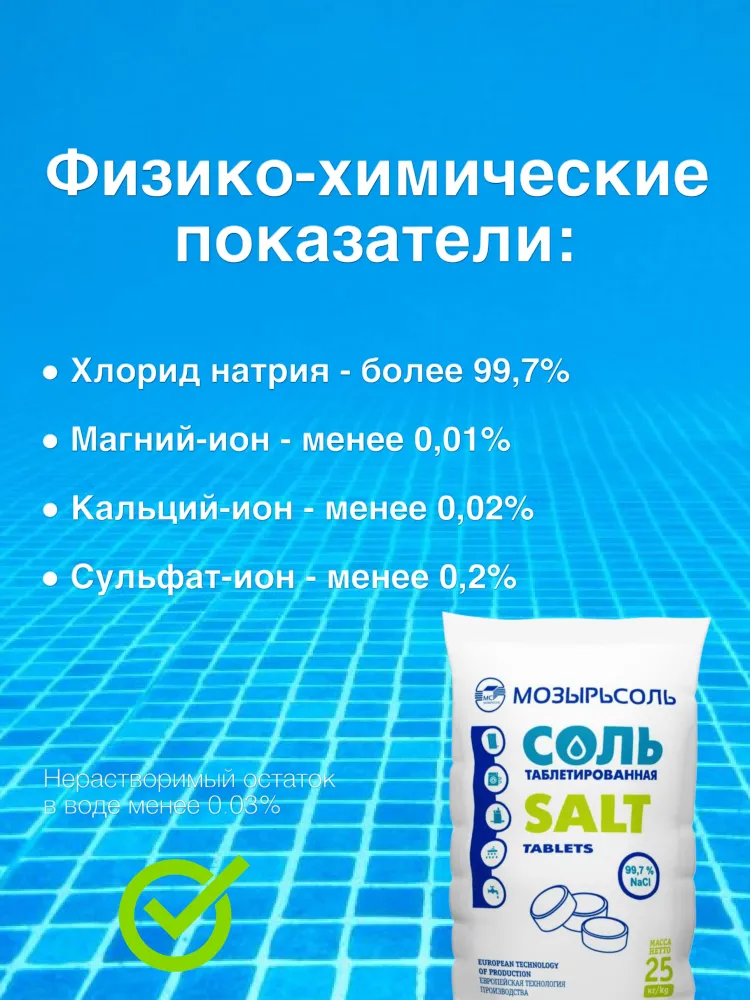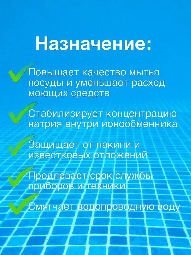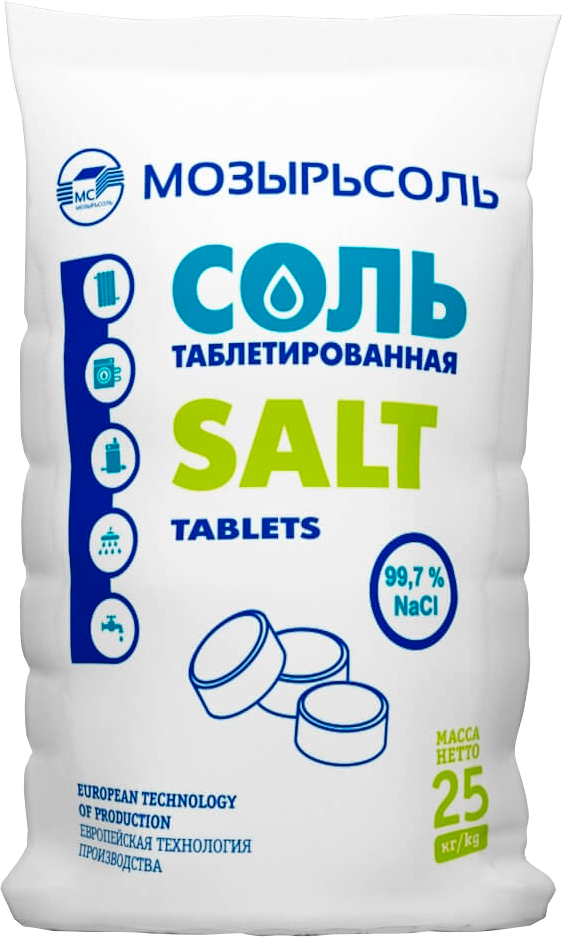 Таблетированная соль освобождает от необходимости перемешивания, имеет форму, которая предотвращает слеживание и образование нерастворимых осадков в баке-солерастворителе, обеспечивает равномерное растворение по всему объему загруженной соли.