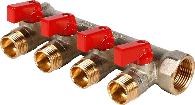 | Коллектор с шаровыми кранами 3/4", 4 отвода 1/2" (красные ручки)(STOUT) | Артикул SMB 6200 341204 | Размер 3/4"х1/2" с 4-мя кранами |