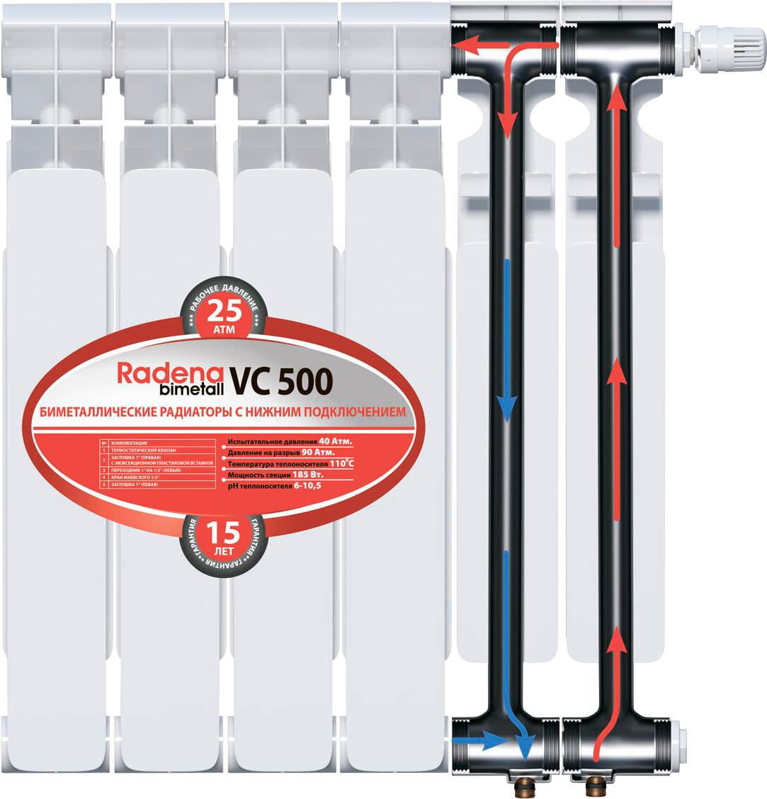 Радиаторы Radena VC с нижним подключением комплектуются термостатическим клапаном, расположенным в верхнем коллекторе правой секции, заглушками 1" (правая), 1 " (левая), переходником 1" на 1/2 и клапаном Маевского (воздухоотводчик). Термоголовка, клапан двойного подключения, кронштейны для крепления на стену - в комплект не входят.