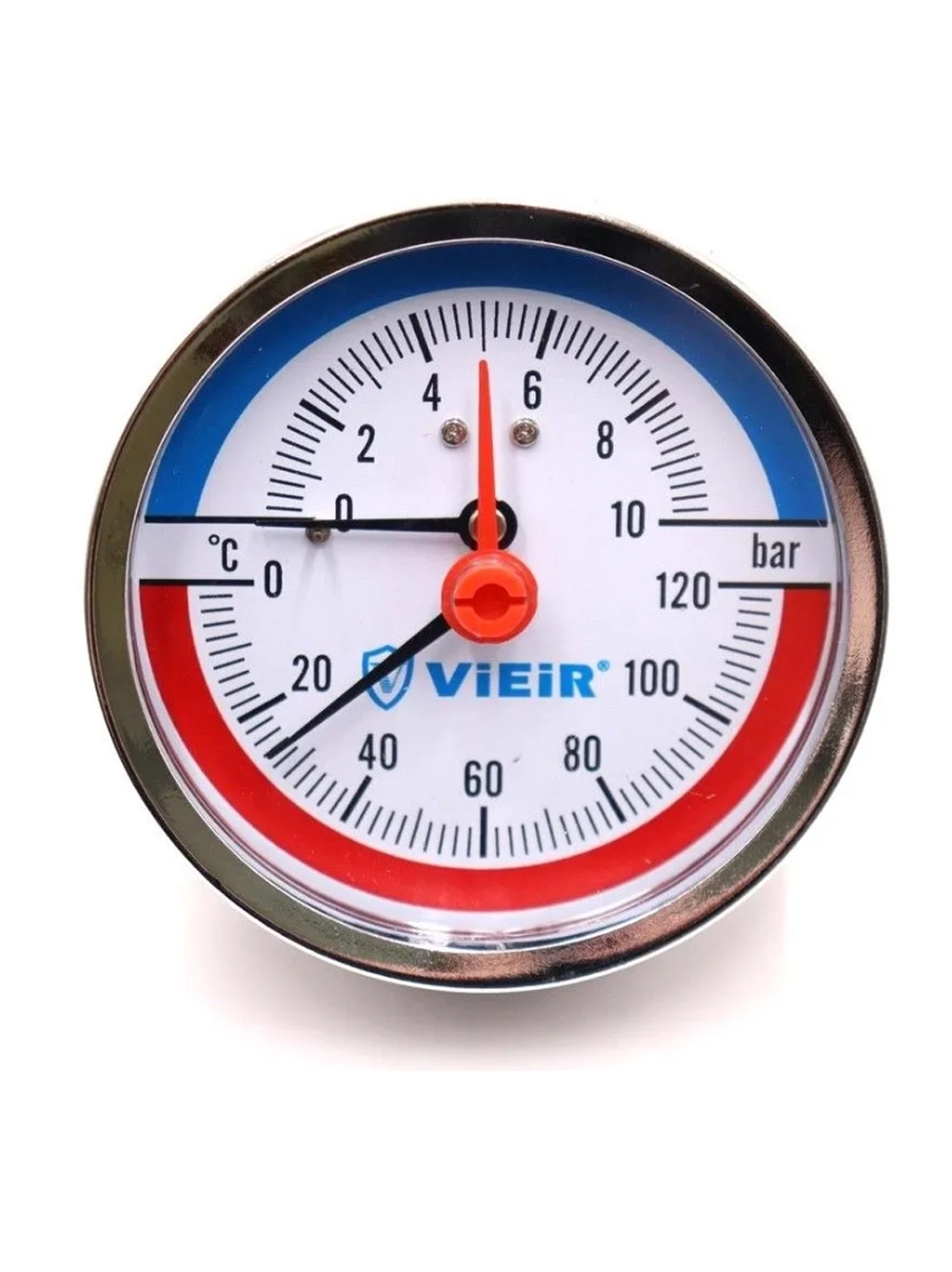 ViEiR Термоманометр 1/2", горизонтальный (80 мм/10 бар) (YF10). ViEiR Термоманометр с горизонтальный подключением применяют для контроля избыточного давления жидкостей или газов, контролируемая среда не должна быть вязкой, кристаллизующейся, а также их температуры до + 120 °C.