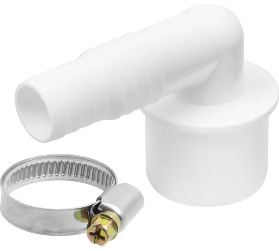 Штуцер угловой с хомутом для сливного шланга стиральных машин d40 - 19/22 мм MasterProf помогает присоединить сливной шланг к фитингу внутренней канализации, что обеспечивает слив воды из бытовой техники. Для прочности соединения сливного шланга с переходником рекомендуется укрепить соединение металлическим хомутом.