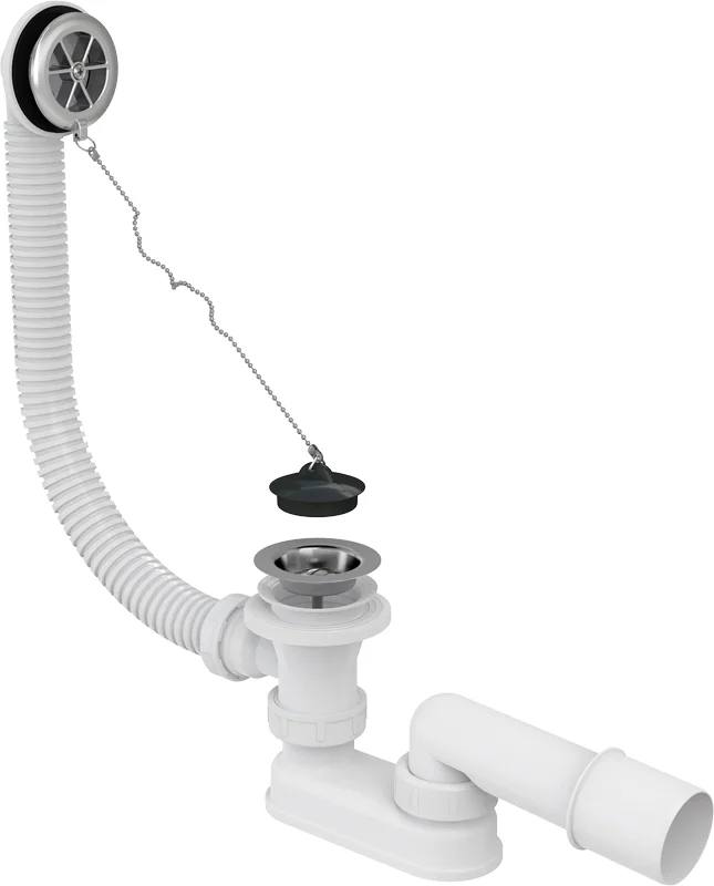 Сифон представляет собой классическую конструкцию, которая закрывает сливное отверстие в ванне, а также отверстие для перелива. Закрытие и открытие сливного отверстия происходит с помощью ПВХ заглушки, прикрепленной цепочкой к переливу. Максимальная высота между отверстием слива и отверстием перелива составляет 370 мм. Решетка перелива изготовлена из пластика с хромированной поверхностью, материал, из которого сделан слив-перелив Alcadrain устойчив к воздействию химических чистящих веществ и перепадам температур.