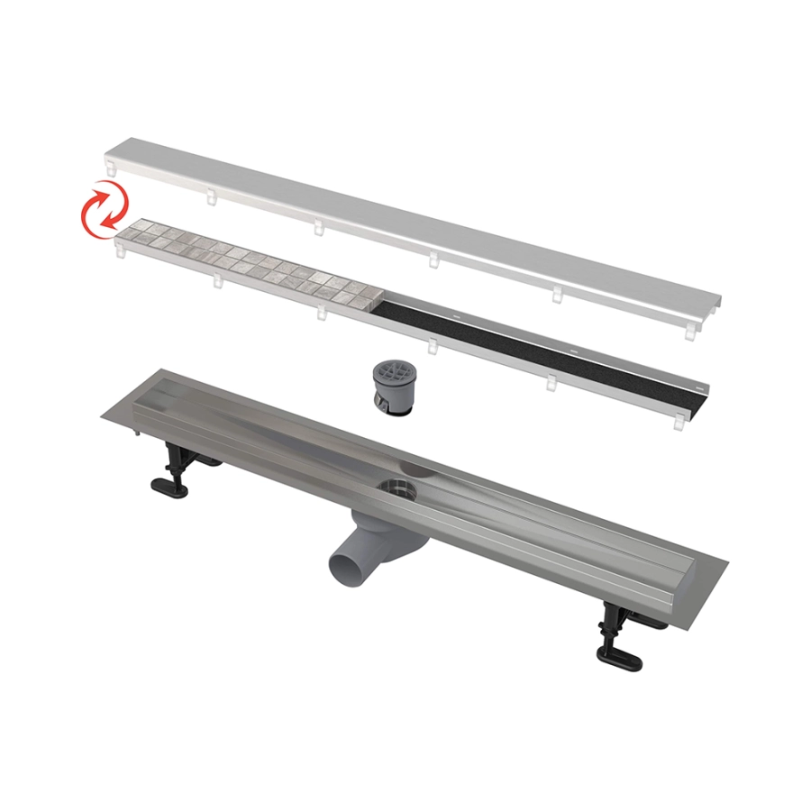 Для безбарьерного доступа Для водоотведения в душевых на уровне пола Может располагаться в пространстве или непосредственно у стены Для использования внутри помещений Свойства Материал желоба: нержавеющая сталь 1,5 мм, AISI 304, DIN 1.4301 Сливные трапы из одного фрагмента стали Водоотводящий желоб из нержавеющей стали (обработанной методом травления и пассивации, а также прошедшей электрохимическую полировку) Самоклеящиеся ленты для качественной гидроизоляции Уклон внутренней части желоба Высота монтажа от 54 мм Лоток защищен полистирольным уплотнением Регулируемый по высоте Гарантия 25 лет