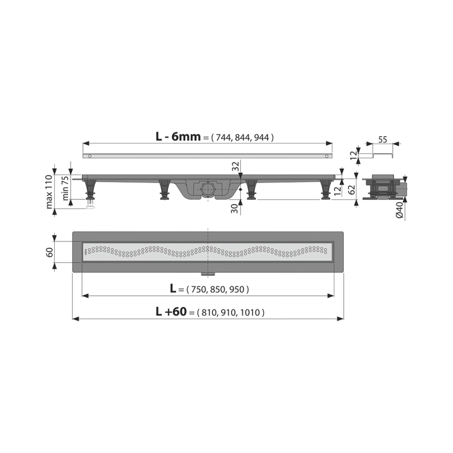 Для использования внутри помещений Для водоотведения в душевых на уровне пола Может располагаться в пространстве или непосредственно у стены Для безбарьерного доступа Свойства: Сливные трапы из особопрочного пластика, который устойчив к морозам и химии Высота монтажа от 62 мм Регулируемые монтажные ножки 0 – 35 мм, позволяют быстро и удобно установить желоб и выровнять его в горизонтальной плоскости Повышенная устойчивость к химическим средствам Идеальная совместимость с гидроизоляцией здания Комбинированный гидрозатвор обеспечивает надежную защиту от проникновения запаха из канализации и после испарения воды в сифоне. Вручную легко чистящийся сифон, вплоть до сточной трубы Решетка является частью комплекта Самоклеящиеся ленты для качественной гидроизоляции Материал: полипропилен обогащенный тальком Нормы и стандарты: ČSN EN 1253 Технические параметры: Комбинированный гидрозатвор с водяным столбом 29 мм Скорость стока воды 27 л/мин. Сопротивление гидрозатвора 640 Па Диаметр сливной трубы 40 мм Минимальная толщина бетона 62 мм Общая высота монтажа (H2) 75 – 110 мм Максимальная нагрузка 300 кг