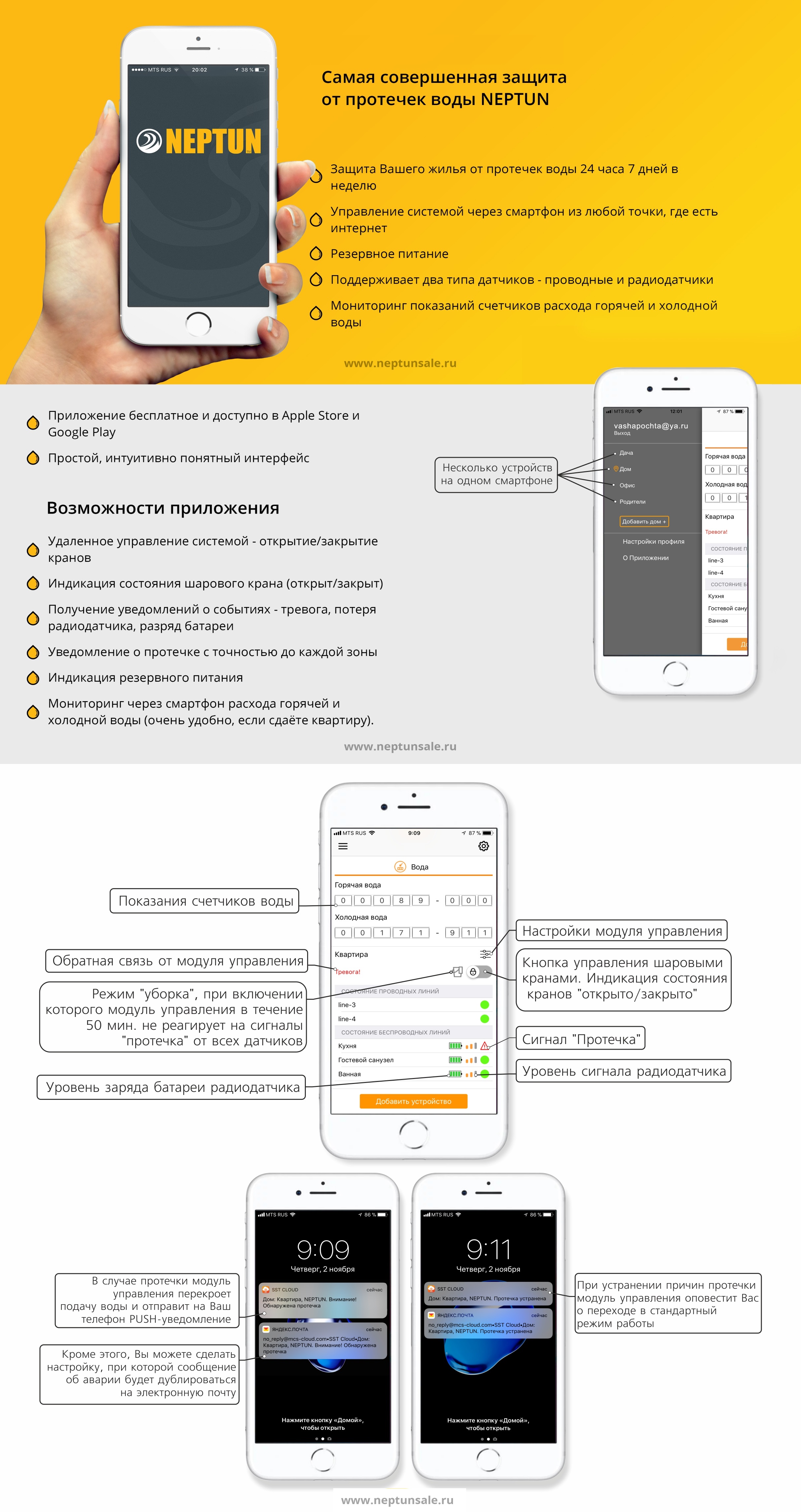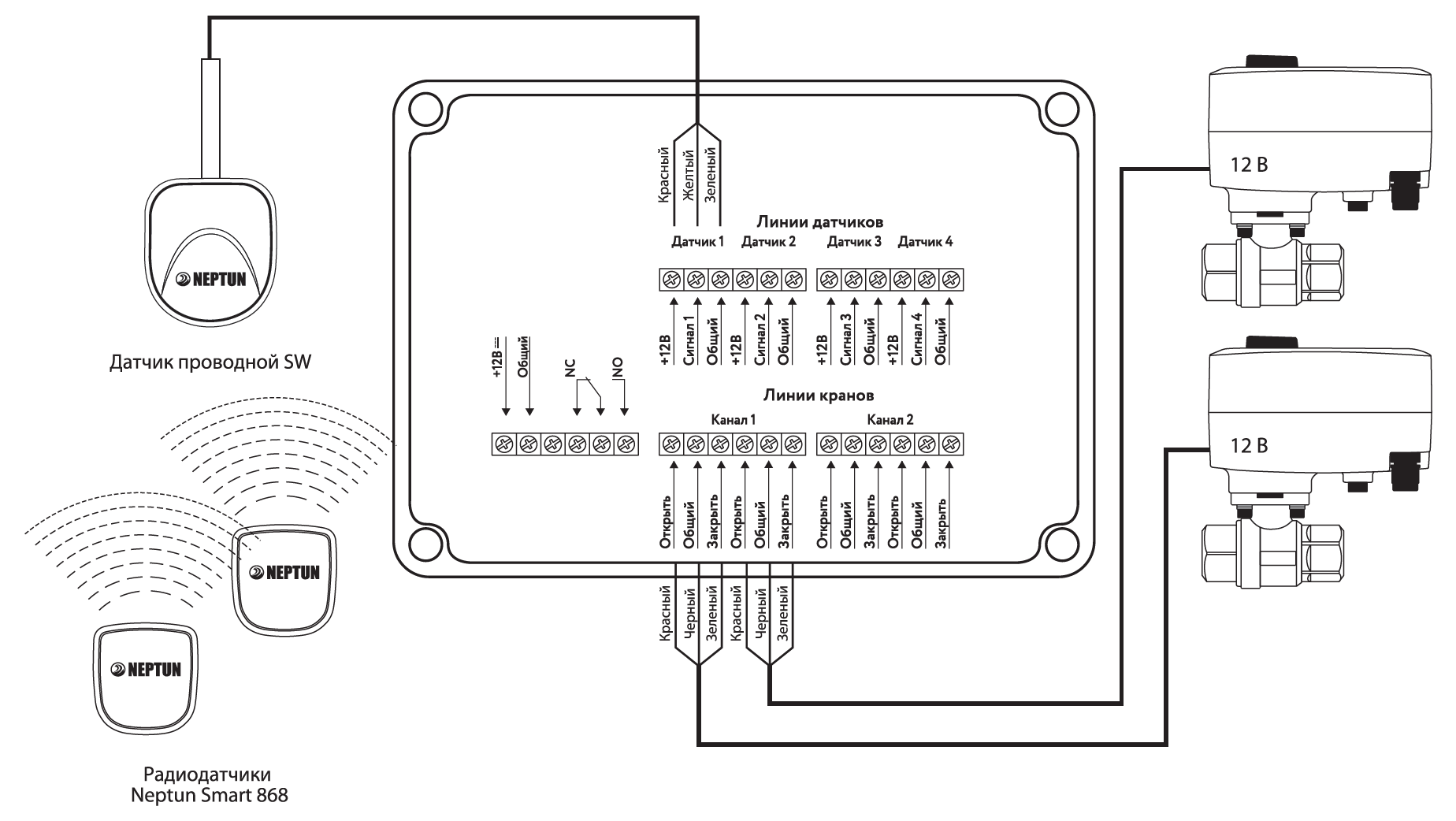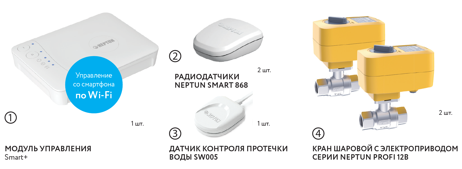 Умная система защиты от протечки воды Neptun PROFI Smart+ предназначена для обнаружения и локализации протечек воды в системах водоснабжения. Компоненты системы связаны и взаимодействуют друг с другом через центральный контроллер (модуль управления Neptun Smart+), который может быть укомплектован дополнительными платами расширения: