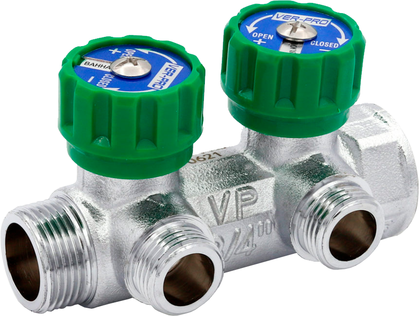 ViEiR Коллектор с регулировочными вентилями 3/4"х1/2" (TP) 2 выхода VER402-A - это универсальный распределительный коллектор диаметром 3/4, оборудованный вентилем на каждом выходе для плавной регулировки мощности потока воды. Оснащен отверстиями на 2 выхода диаметром 16 мм. Выходы на 1/2 дюйма.