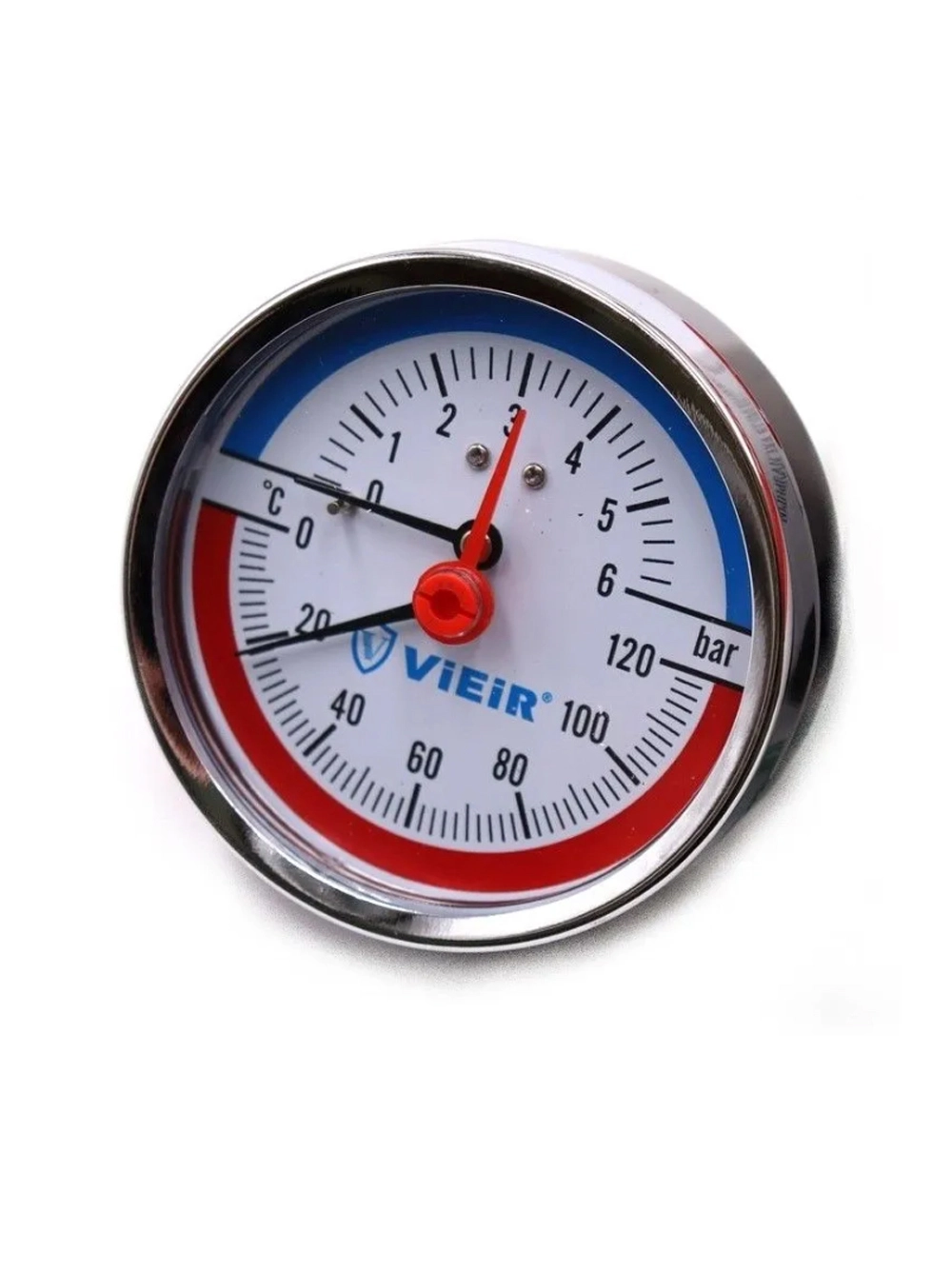 ViEiR Термоманометр 1/2", горизонтальный (80 мм/6 бар) (YF6). ViEiR Термоманометр с горизонтальный подключением применяют для контроля избыточного давления жидкостей или газов, контролируемая среда не должна бытьне вязкой, кристаллизующейся, а также их температуры до + 120 °C.